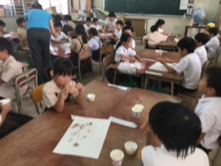 ひまわりの種をみんなで数えました。みんなの予想は、400から1000個くらい。一人一人か、10個ずつカップに入れて合計しました。なんと、1418個もありました!!すごいですね。