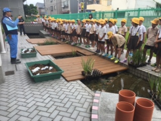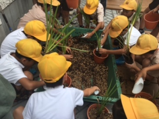 3時間目、旭区役所、鶴見公園事務所、ボランティアの皆さんの応援のもと、菖蒲の苗の植え替えを行いました。6月に株分けをしてから、随分根が育っていました。大きな鉢に植え替えをして、肥料をやりました。