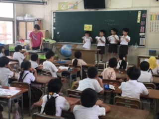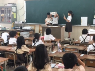 1時間目が始まる前の朝学習の時間です。たし算やひき算のカードを係の子ども達が見せて、みんなで答えています。毎日繰り返すことで、力がついていきます。