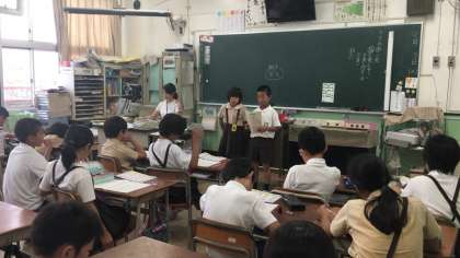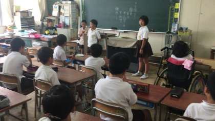 漢字、計算などが終わった子から、社会科の新聞作りなどを自分で進めています。朝の会のスピーチでは、夏休みのことなどを詳しく話しています。みんなも一生懸命聞いています。