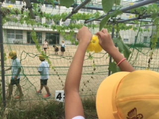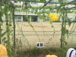 学習園でヘチマの雄花と雌花を探し観察していました。花粉をセロハンテープ出て取って、顕微鏡で見るようです。それにしても雄花ばかりで、雌花があまり見当たりません。ヘチマの実は、1つだけできています。