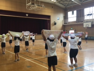 運動会のダンスの練習です。すばやく動いたり、体を大きく使ってタオルを振ったりととても楽しそうに踊っています。