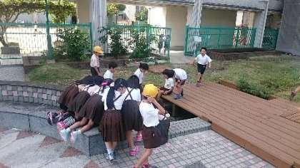 休み時間のビオトープは今日も自然に親しむ子どもたちでにぎわっています。水辺にいるメダカを見つけてはじっくり観察しています。