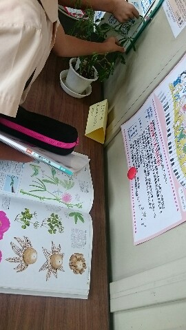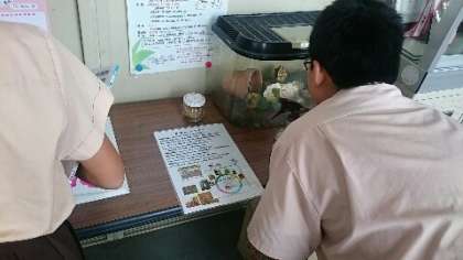 オジギソウはツンツンとつついて、生き物のように動く様子を見て楽しんでいます。スズムシはリーンリーンと音が発生する様子をじっくり見ています。図鑑や解説プリントが置かれているので、実物を見て資料を読んで、へえ、と感心しています。