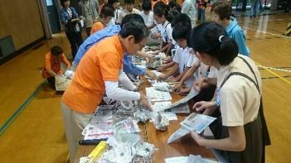 ここでは、新聞紙で食器を作りました。避難生活をする際、食器がない場合、新聞紙でお皿を作り、その上にラップをかけます。2つの日用品を組み合わせることで食器の出来上がりです。カレーライスや味噌汁も大丈夫そうです。