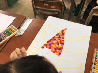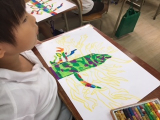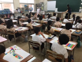 「魔法の木」を描いています。国語科の学習で、どんな木があったらいいかなと想像を膨らませて発表しました。その学習と関連付けて、さらにイメージを広げて描いていきます。どんな作品になるか楽しみですね。
