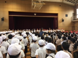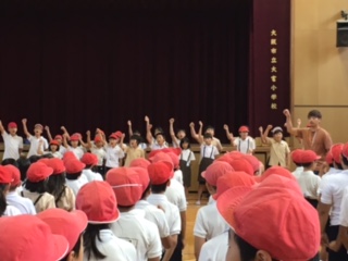 校歌と運動会の歌を練習しました。応援団の子ども達が前に出て、盛り上げています。当日も元気よく大きな声で歌いましょう。