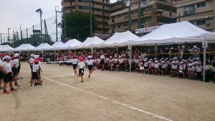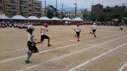 4年生の個人走。運動会では初めてトラックを1周します。バテないように練習をしてきました。本番ではどの子も全力を出し、一心不乱に走り切っていました。走りながら受けた観客席からの声援が大きな励みになっていたようでした。