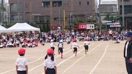1年生の個人走です。直線コースを走りました。幼稚園や保育所とちがって距離が長いと感じたのではないでしょうか?それでも、ふだんからの元気があふれる力走で友だちと競い合っていました。