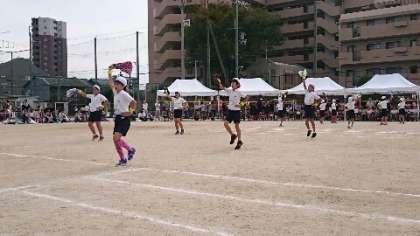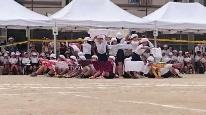 4年生の団体演技です。タオルをぐるぐる回したり、広げてかざしたりして、踊ります。一人一人、どんな景色を想像しながら踊ったのか気になるところです。曲のリズムに乗って跳んだりしながら、笑顔あふれるダンスを披露しました。