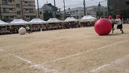 2年生の団体競技は大玉転がしです。2人だけで大玉を操るのはなかなか大変です。特にコーンを回るためにスピードを調整するのが難しいです。しかも、夢中で押すあまり、体が大玉に持っていかれて一緒に回転しそうになる場面もありました。しかし、どの子も2人で協力して好勝負を繰り広げていました。
