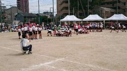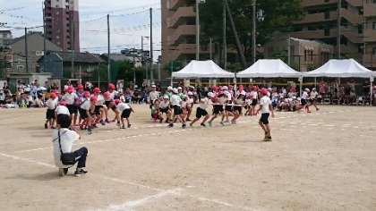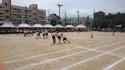 4年生の団体競技は台風の目です。3人一組で棒をもって走ります。台風の目のようにくるくるとコーンを回ります。そして、待っている人たちは足元に棒が来たら一斉に跳び上がり、頭上を通る時にしゃがみます。常に気を抜いていられません。4つの台風はどれもスピードが速かったです。