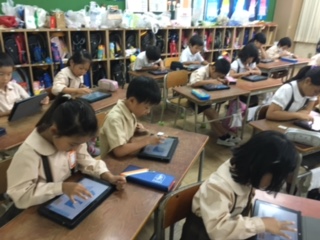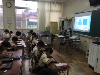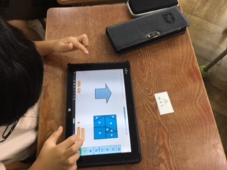 三角形、四角形の学習に入りました。タブレットを使ってパズルを動かして、見本の形を作っていきます。いろいろな方法があり、子どもたちは、試行錯誤しながら形を作っていきました。