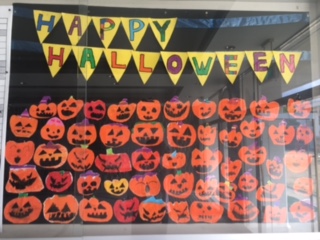 玄関にいろいろな顔のかぼちゃが勢ぞろいしました!2年生が作ってくれました。それぞれの個性が光っています。