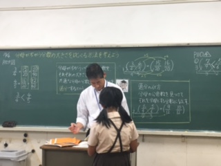 3つのコースに分けて学習しています。今日は一つの部屋だけのぞいて見ました。分数の通分のところの学習です。課題を一人一人が自分のペースで進めていて、休み時間になっても続けて問題を解いていました!