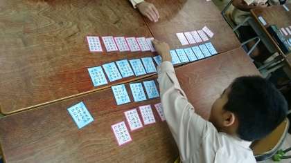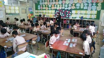 2年生が教室で百人一首に取り組んでいました。初めての子も多く、読まれた札の言葉を必死に探しています。見つけるのにまだまだ時間はかかりますが、発見して取れたときの嬉しさは格別な様子でした。