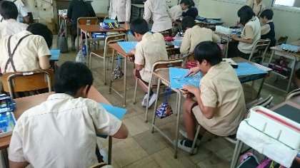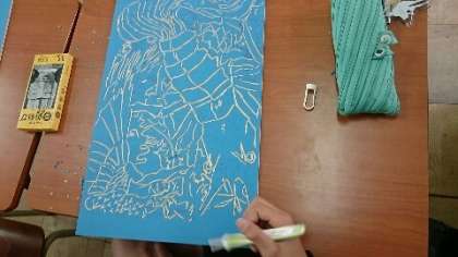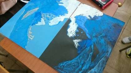 浮世絵をモチーフに多色刷りの木版画に挑戦しています。細かい部分まで彫刻刀で彫れています。色を重ねて刷りながら、かなり本物に近づいている作品もありました。完成が楽しみです。