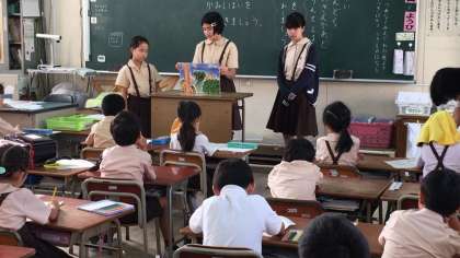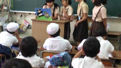 朝の読み聞かせタイムです。静かにお話の世界に引き込まれている1.2年生です。
