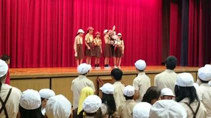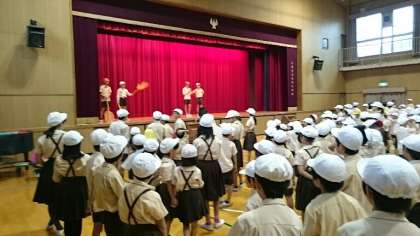 クイズのあと、5年生代表が来週水曜日に予定されている人形浄瑠璃の芸術鑑賞会のお知らせをしました。舞台で人形を操りながら紹介したので、みんなの目は釘付けになっていました。水曜日が楽しみですね。また図書委員会から読書週間のお知らせもありました。