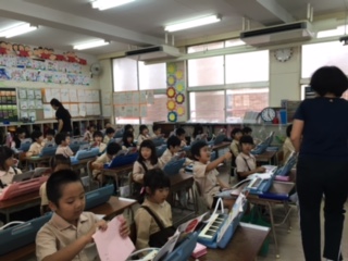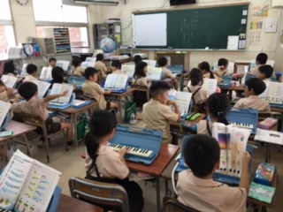 鍵盤ハーモニカで練習です。音を楽しみながら、吹いています。
