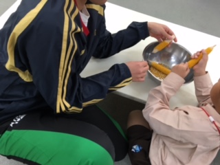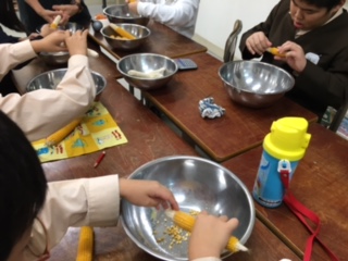 学習園で収穫したトウモロコシの実をみんなで一つずつとっています。このトウモロコシは、ポップコーン用のものでやや小ぶりで色も少し濃いめです。たくさん実をとって、おいしいポップコーンを作ろうと、みんなでワイワイ言いながら進めていました。結構かたくて取りにくく、手が真っ赤になっていたのですが、頑張っていました。楽しみですね!