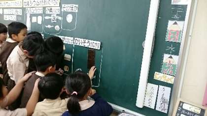 子どもたちは牛乳のなかま、魚のなかま、野菜のなかま、海藻のなかまから知っている食べ物を探しました。海藻では、わかめはすぐに思いつくのですが、こんぶがなかなか出てきません。なんやろ?なんやろ?と一生懸命考えていました。海苔は実物が貼られ、さわって確かめていました。