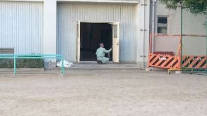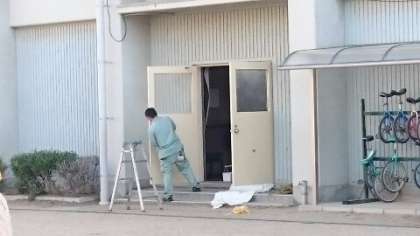 管理作業員さんが講堂の扉を塗り替えてくださっています。前は紺色でしたが、新しくベージュに塗り替えています。講堂の雰囲気がガラッと変わりますね。
