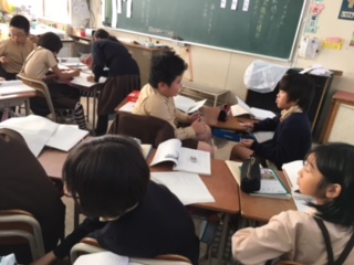 「大造じいさんとがん」の第5場面を実習生のT先生と一緒に学習しました。残雪に対する思いが変わっていくところを情景描写を手がかりに読み取ります。自分での読みを持って、3人で交流し合いました。まだまだ深まっていきそうです。