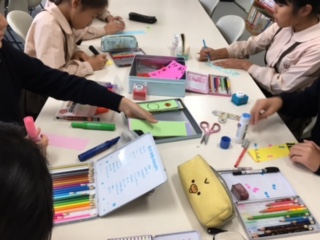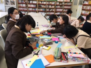 今日の6時間目は、委員会活動の時間です。図書委員会では、みんなにたくさん本を読んでもらうため、しおりを作っていました。