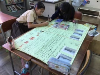広報委員会は、毎月の新聞の他に、今月の16日から始まる「作品展」のポスターを作っていました。各学年のテーマや見どころなどを知らせてくれるそうです。