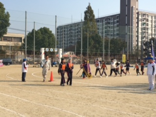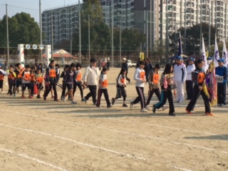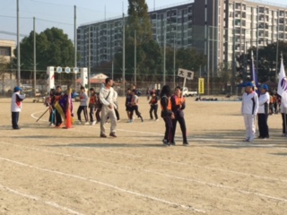 9時から旭公園グラウンドで連合対抗のスポーツフェスティバルが開催されています。今年で22回目の大会で、大宮地区は、昨年度優勝しています。優勝旗を持った子ども達を先頭に元気に入場しました。