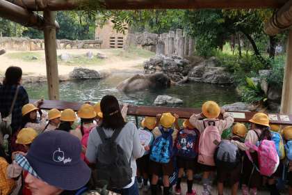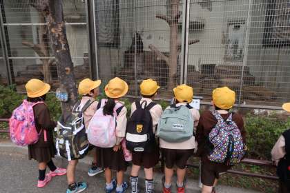 雨で順延になっていました1年生の校外学習、今日は良い天気で「天王寺動物園」へ行ってくることができました。いつもなら入るのにも並んで順番を待つくらい、多くの学校や幼稚園でいっぱいなのですが、今日はスムーズには入れ、余裕をもって園内を見て回ることができました。