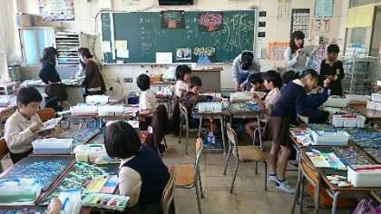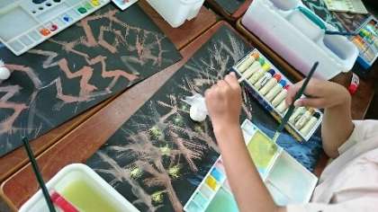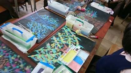 3年生も作品展に向けて、鋭意制作しています。題材は「モチモチの木」。最後のクライマックスで光る木を描きます。黒画用紙に幹と枝を描き、たんぽで葉や実や光を表現します。それぞれが感じ取った物語の世界観が1枚の絵に広がっていきます。マメ太も登場するようです。作品展でじっくり鑑賞してください。