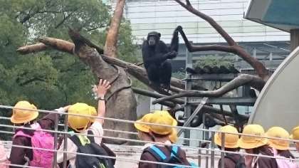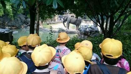 チンパンジーが何度も手を上げ下げしてくれるので、みんな大喜び。「オーイ!オーイ!」とかけ声あげて手を上げて、見事にチンパンジーに操られているようでした。また、ジャングルの中をどんどん進んで出会ったゾウは、ちょうどエサを食べている最中で、子どもたちは興味津々見ていました。