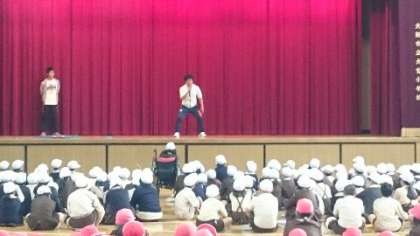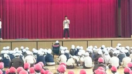 「K先生とF先生が一発芸をして、校長先生がどちらがよかったかを予想する。」でした。集会委員、恐るべしです。先生二人にとっては、たまってものではありません。しかしそこはさすが大宮小学校の先生!勇気をふりしぼって全校の前で渾身の一発芸を披露しました。すごい度胸です。子どもたちにも見習ってもらいたいほどです。結果は引き分け。それぞれを予想した子どもたちにとっては意見が分かれるところもありますが、校長先生は一生懸命さに甲乙つけがたしと判断されました。がんばった先生たちと集会委員のおかげで、朝から大いに盛り上がりました。