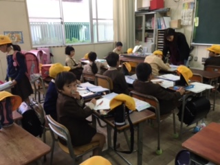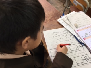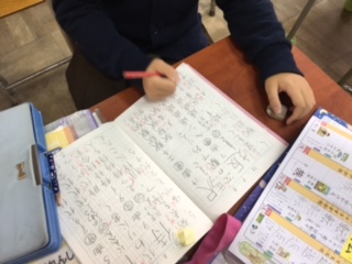 放課後のおさらい教室です。宿題をやったり、終わった子は計算カード、読書などしたりして、上手に時間を使っています。キッズの先生に励まされて仕上げると、すっきりした顔で帰っていきます。