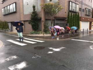 今朝は冷たい雨が降っていました。各町会の見守り隊の皆さんや、職員も出て、子ども達の登校を見守りました。