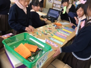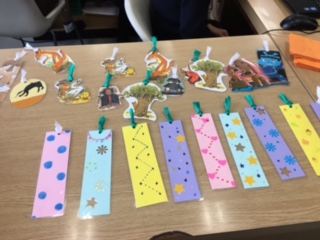 昼休みの図書館開放の時間、のぞいてみるとステキなしおりが並べてありました。読書週間にちなんで、手作りのしおりをみんなに渡していました。お話の登場人物をかたどったしおりもあり、欲しくなりました!