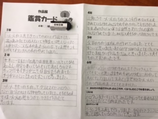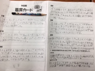 作品展を見に行った4年生。展示してあった各学年の作品の感想を書いていました。友達の良いところをたくさん見つけて書いています。もちろん、自分の頑張りも記していますよ!