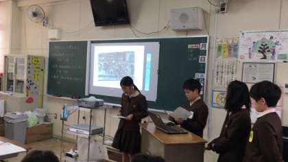 平和学習について調べ、考え、まとめてパワーポイントで発表しました。発表の内容、発表の仕方など各教科で学習してきたことを活かしての発表です。