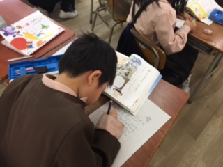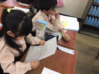 「おとうとねずみチロ」の学習も終盤です。学習したことを振り返りながら、チロにお手紙を書きました。「チロへ、赤と青のしましまのチョッキがとどいてよかったね・・・」などなど。お家での音読の時、感想を聞いてあげてくださいね。読むことがもっと好きになりますよ。