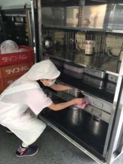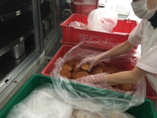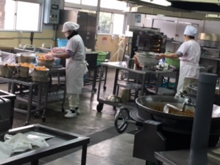 給食室は、朝から大忙しです。小学校と今市中学3年生の給食を4人で作っています。11時半には、中学校へ運ぶためのトラックが来て、業者さんに運んでもらっています。