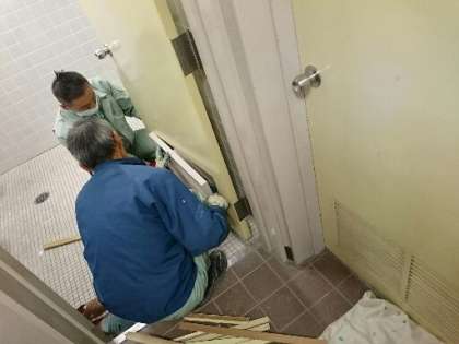 管理作業員さんが、体育館のトイレの扉の修理をしてくださいました。通風口の部分が直りました。ありがとうございました。