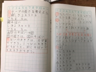 かけ算の九九がほぼ終わり、九九の表を見ながら気づいたことなどを書きました。同じ答えになる九九もいくつかあることを見つけました。日常生活でも使えるといいですね。