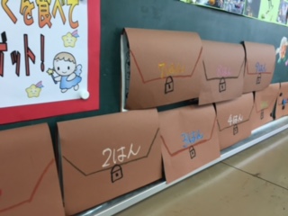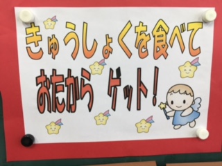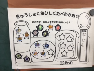 「毎日給食をおいしくしっかり食べましょう!」ということで、班ごとに食べたらシールをはっています。
