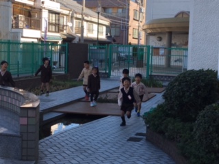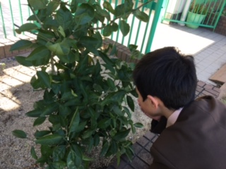 ビオトープは、北側にあり、陽が当たらないのですが、1年生が観察に来ていました。「メダカはどこにいったのかな?」「みかんの葉を揉むと手にみかんの匂いがつくよ」などなど。寒くても元気一杯の1年生です。