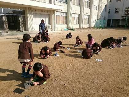 いつもはわいわい元気に活動する3年生が、一言もしゃべらずに何かしています。今日は虫メガネで日光を集めて、黒画用紙に当てる実験をしていました。集められた光が黒画用紙をこがし、煙が出て燃える様を、みんなじぃーっと見つめていました。自然の力、不思議さにどっぷりとはまった時間を過ごしていました。子ども同士ではしないでくださいね。火遊びになりますから。