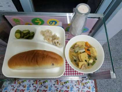 今日の献立は、中華煮、レンコンのオイスター焼き、キュウリの辛みづけ、牛乳、レーズンパンです。