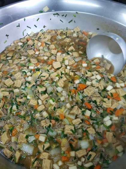 中華煮には、豚肉、いか、厚揚げ、白菜、タマネギ、にんじん、ニラなどがはいっています。とろみがついていて冷めにくく食べやすいです。