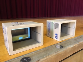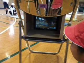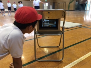 側転など自分の動きをタブレットパソコンに録画し、10〜15秒遅れで見て、手や足のつき方、高さなどまだうまくできていないところを確認しています。タブレットは、段ボール箱に入れて固定し、パイプ椅子に置くと、三脚の代わりになり、便利です。